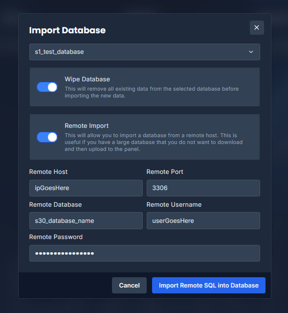 In the import prompt, fill in the remote database connection details from your old host: